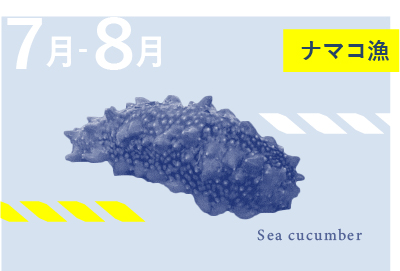 7月の碧海の海には、時おり黒い煙を吐きながらナマコ漁をする船を観ることができます。八尺と呼ばれる鉄の塊を船で引っ張り豪快に漁獲します。危険を伴う漁なので一瞬たりとも気を抜けません。そうして漁獲されたナマコは黒いダイヤと呼ばれ、品質、味ともに最高級品として中国へと輸出されます。