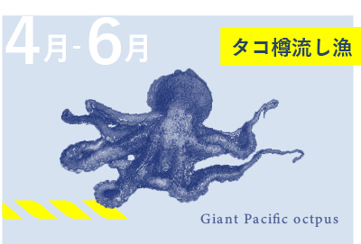 国産ダコ漁獲量の6割を占める北海道。北海道のタコと言えばやはりミズダコです。ウキと竿の役割である樽を、潮の動きを利用して流し、縄張り意識の高いミズダコが樽の先についた「イサリ」に反応し、襲い掛かってくるところを狙います。海底地形の把握や潮読み等、漁師としてのセンスも問われるとても奥が深い漁法です!
